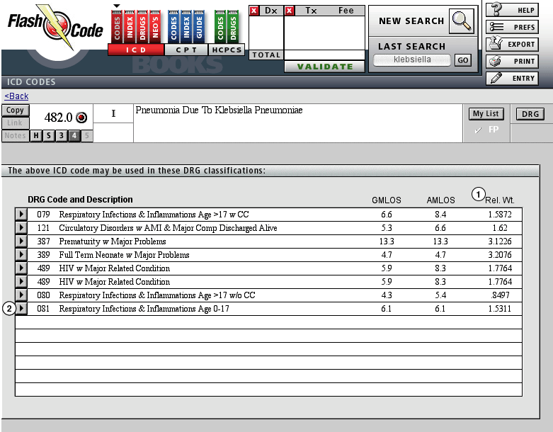 | You can see what DRG classifications any ICD might be a part of by finding the ICD code you wish, then clicking on the DRG button (provided it is active). Here's an example: A 15 year old male lives in crowded conditions and becomes ill with a mucopurulent sputum. He is hospitalized due to respiratory distress. Chest X-Ray shows pneumonia and the sputum culture returns an identification of the organism as Klebsiella. We perform a search for 'kelbsiella pneumonia' and return the following 3 codes. 1. Code 482.0 is the ICD code we want, the DRG button is active (an inactive button is grayed out at the edges). Clicking the active DRG button will show all DRG's that this ICD code belongs to. |